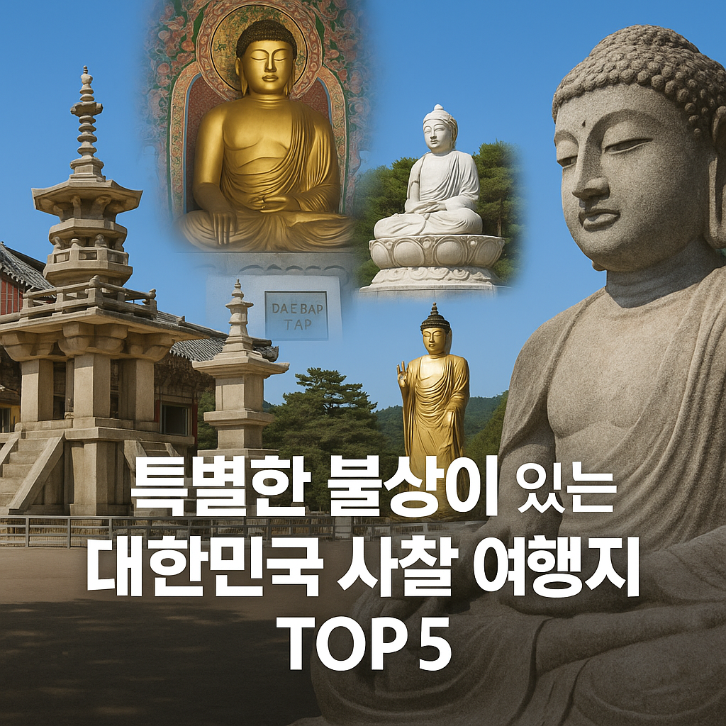 대한민국에서 특별한 불상을 모신 사찰 여행지 TOP 5를 소개합니다. 불국사, 해인사, 통도사, 석굴암, 법주사 등 역사와 문화, 예술을 모두 느낄 수 있는 불교 성지를 한눈에 확인하세요.